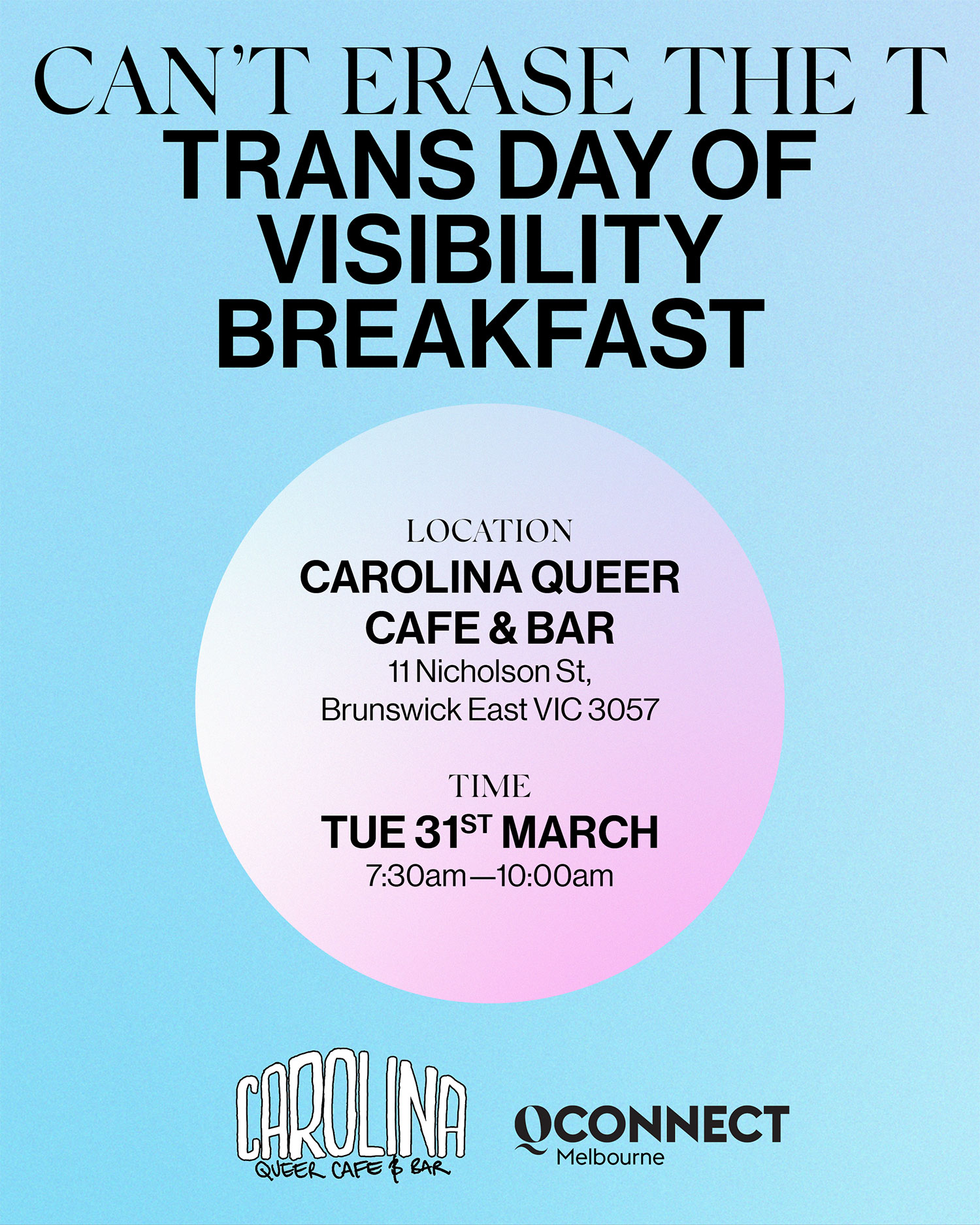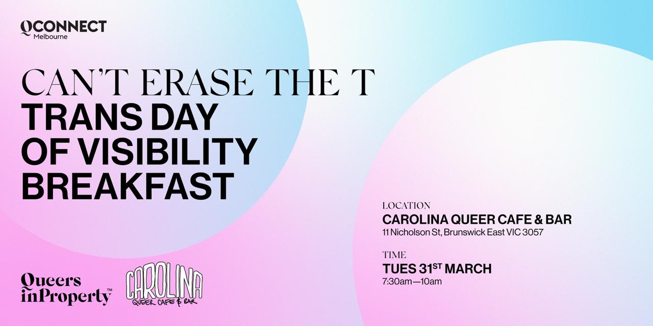 QConnect is coming to the Inner North! This Trans Day of Visibility (TDOV) we will be meeting at Brunswick East’s iconic Carolina Queer Cafe and Bar! It will be a morning to connect, mingle and lift up our trans and gender diverse friends. It will be an opportunity for trans and non-binary people to connect with each other and the broader QIP community so that we can build a community of practice that uplifts us all.